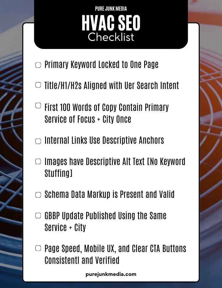 Contact Pure Junk Media your HVAC Professionals and let us tune your site + GBP (updates, Q&A, and conversion paths) for your service areas.